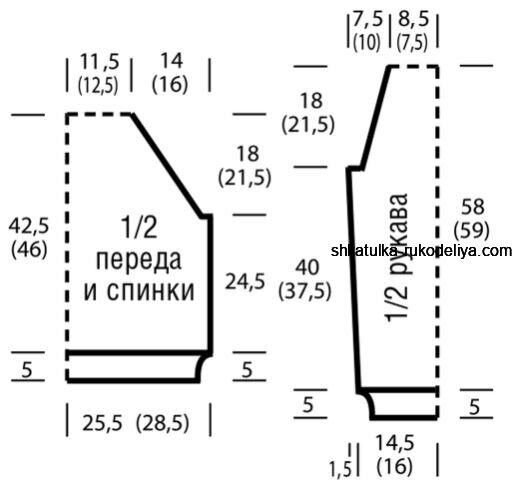 Через 24,5 см = 42 ряда от планки закрыть для скоса реглана с обеих сторон 1 x 3 п., затем выполнить в каждом 2-м ряду 12 (14) x 1 подчеркнутую простую убавку.
