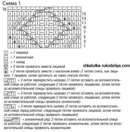 В не приведенных изнаночных рядах все петли провязывать по рисунку. Постоянно повторять 1–16-й ряды.