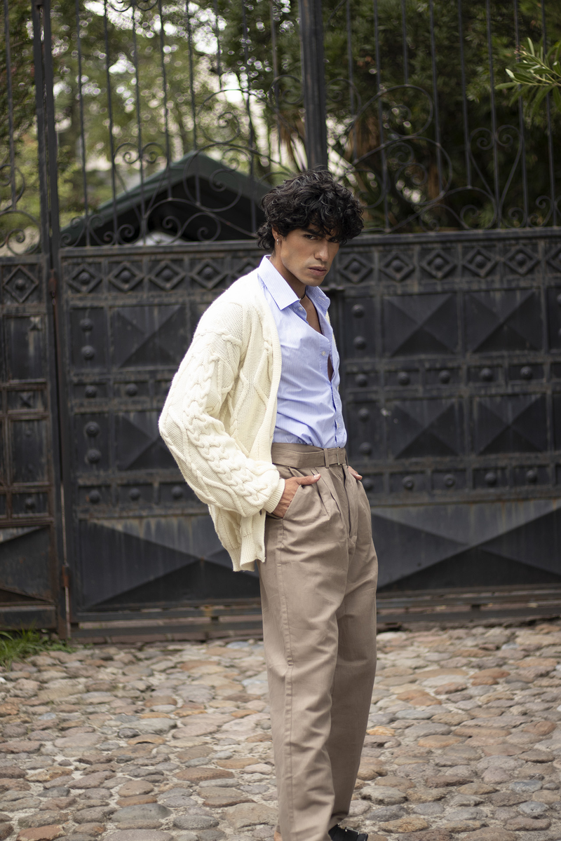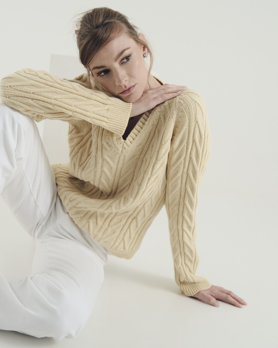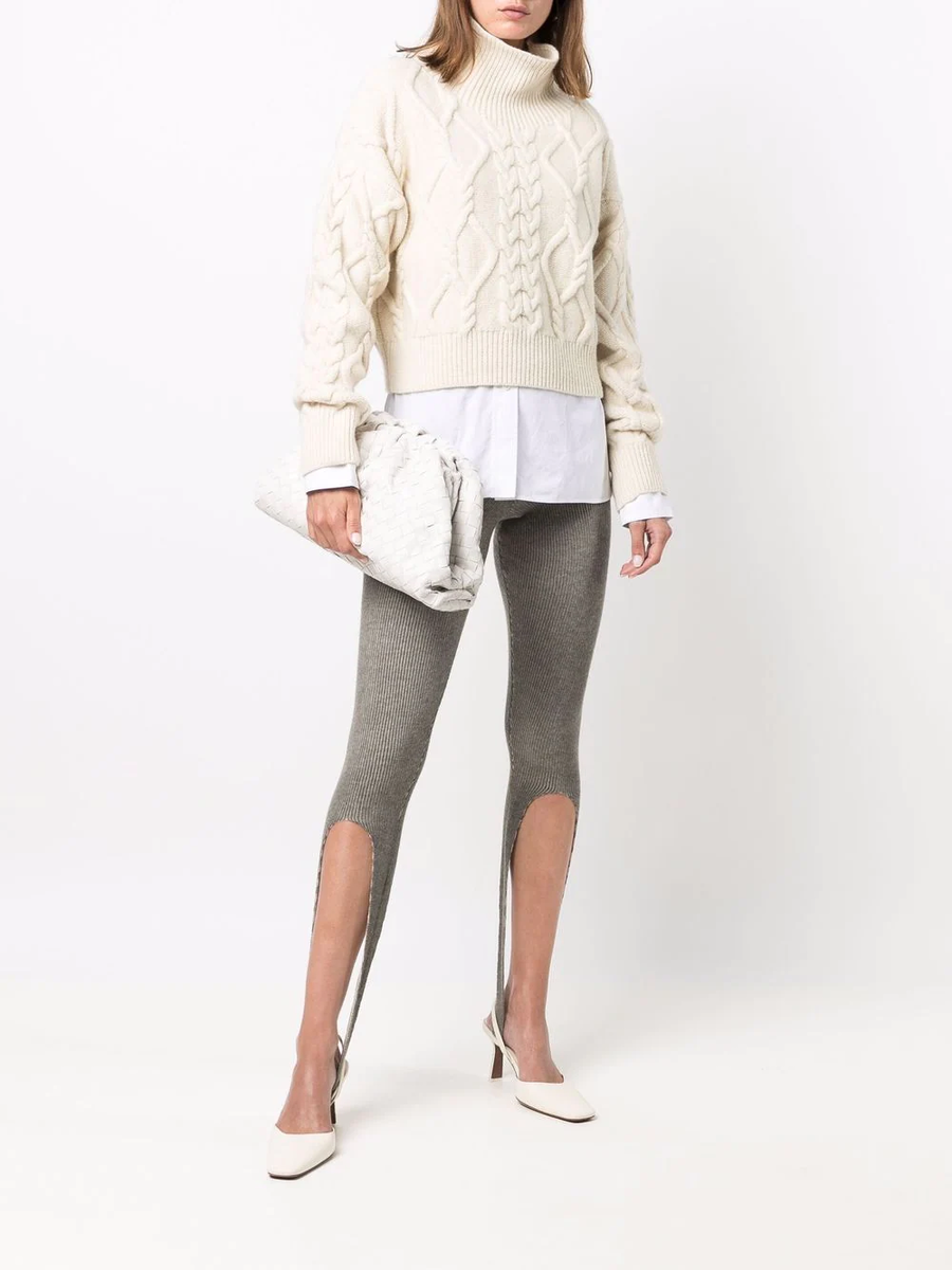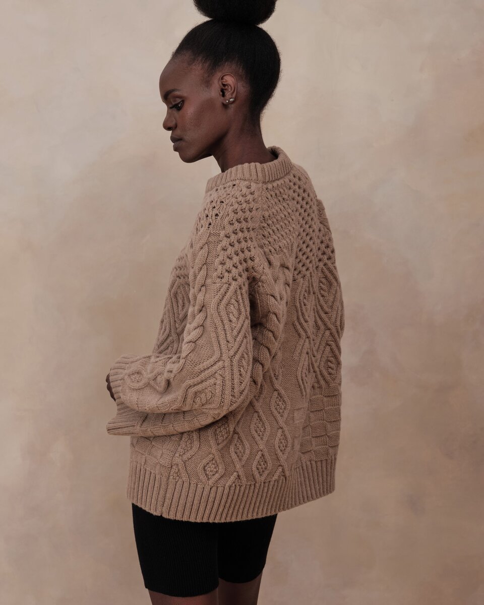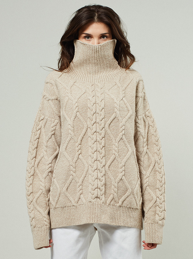 Свитер с высоким воротником и интересным арановым узором средней длины. Мне кажется. что ворот связан из двух половинок и сшит швами наружу: