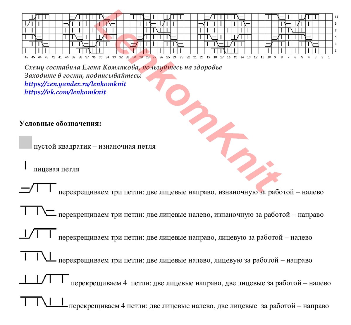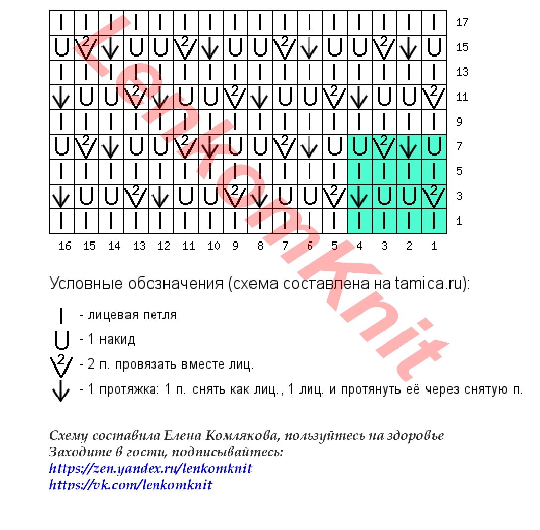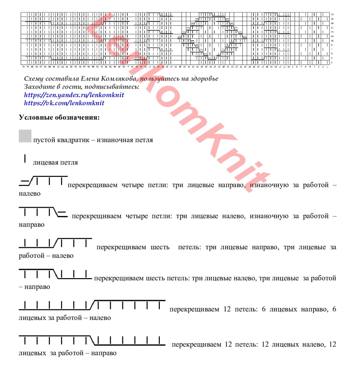 Схема узора составлена для всех трех моделей. Все накиды провязываем скрещенными петлями, чтобы не было дырок. На схеме - полный раппорт узора в высоту и ширину.