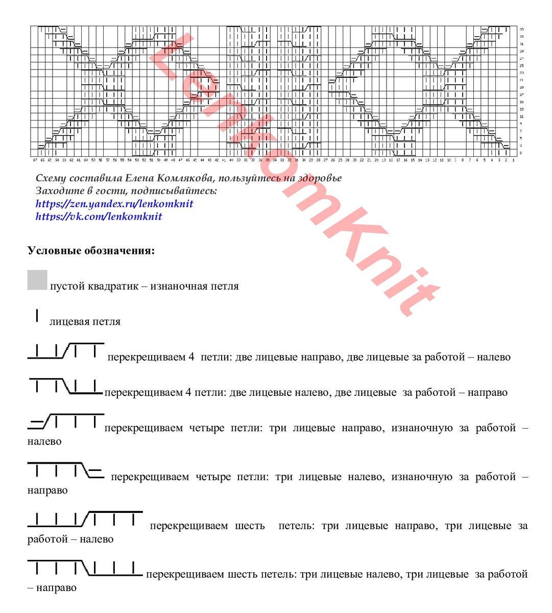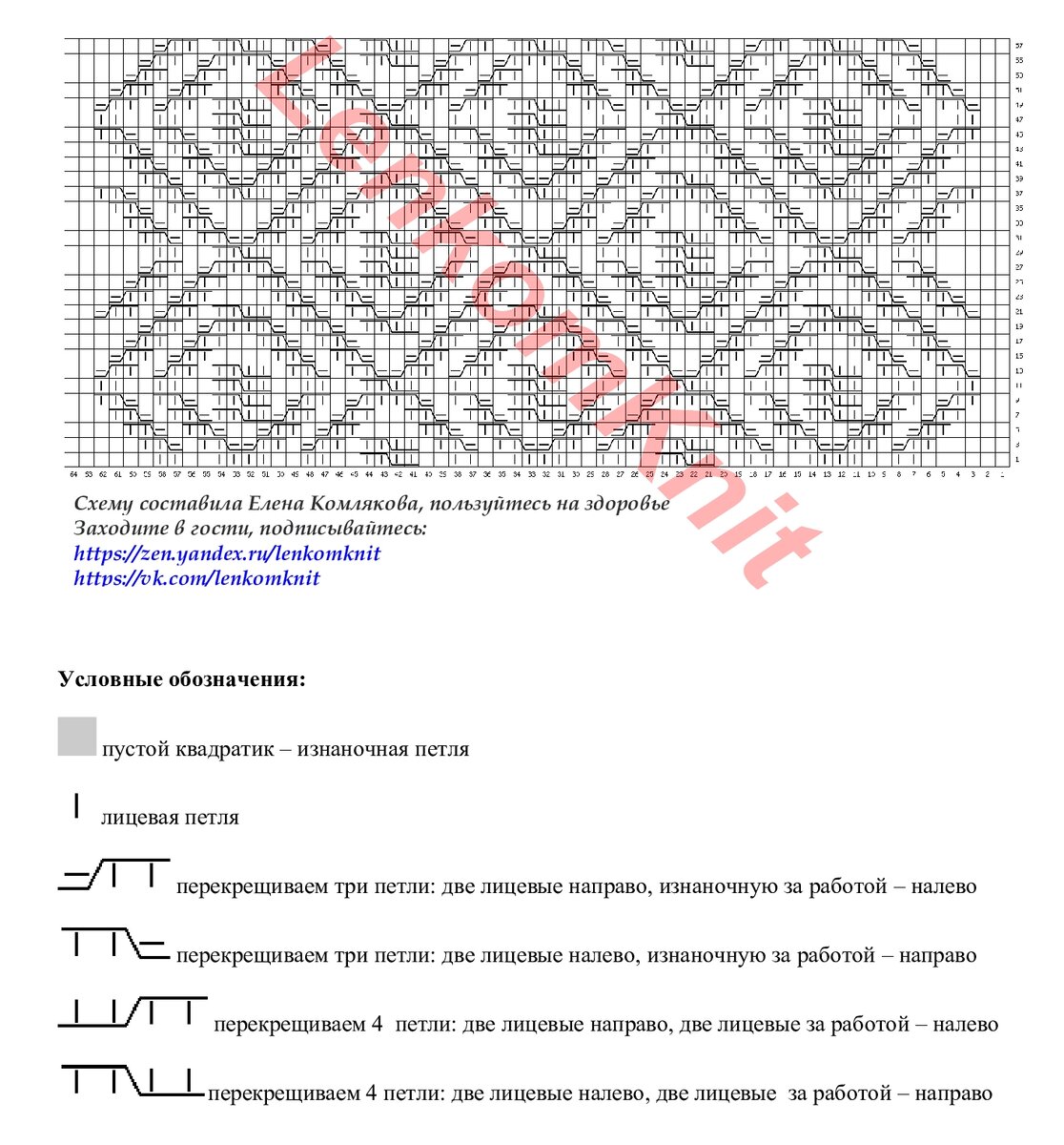 Схема узора № 4. На схеме - один раппорт в высоту. По логике, он должен быть в ширину такой же, как узор № 2 (64 петли) и его нужно делать шире н два ромба.
