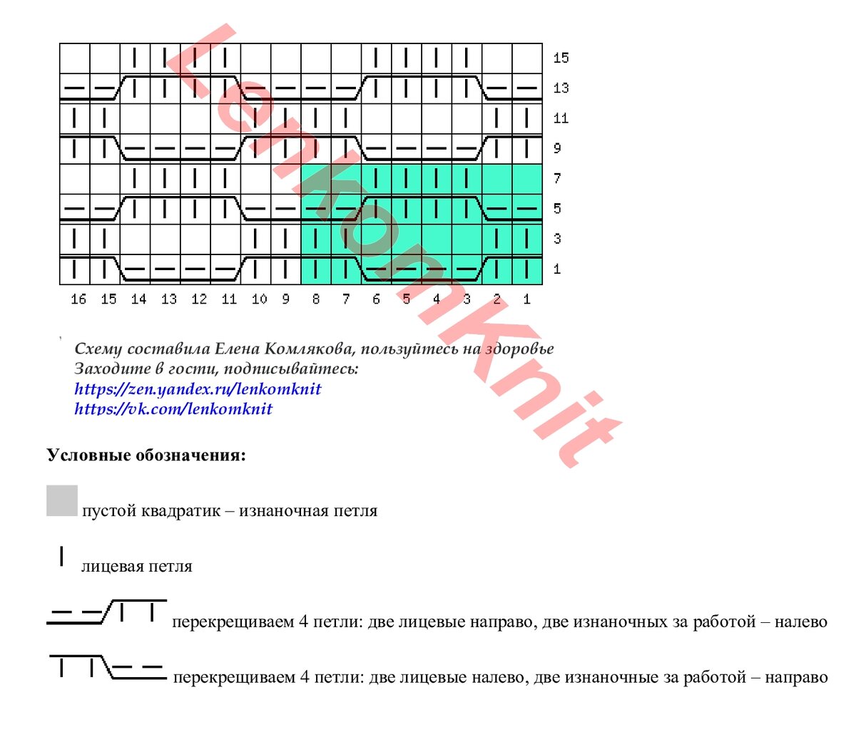 Схема узора № 3. Раппорт выделен зеленым цветом. Этот узор вяжется там, где вывязывается рукав-реглан. Выравниваем этот узор со стороны центра.