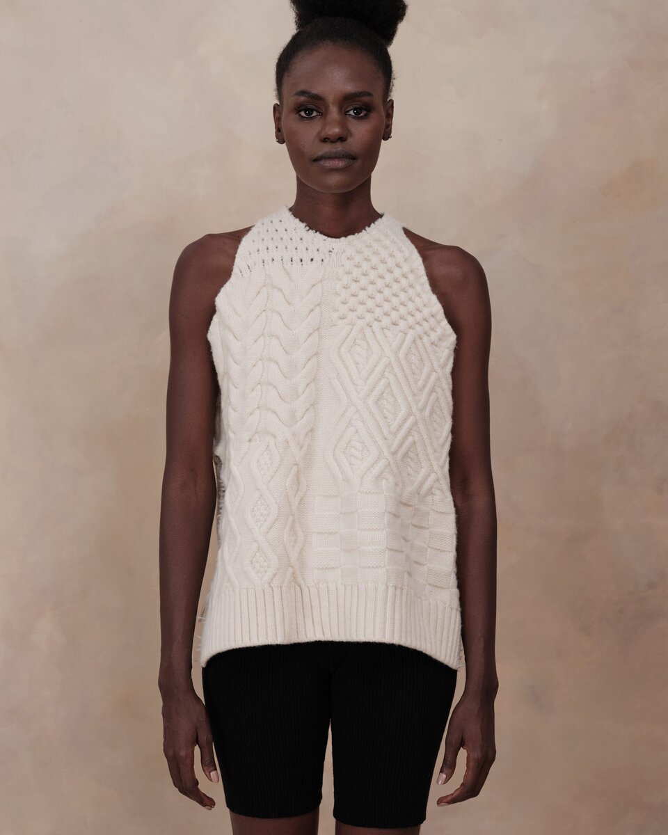 Одинаковыми узорами связаны белый топ с американской проймой и свитер.