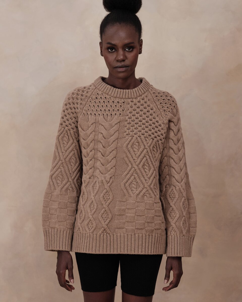 Свитер-реглан связан в стиле пэчворк, в нем скомбинировано шесть узоров. За счет того, что ромбы и косы стягивают полотно, рукава выглядят немого расширенными к низу.