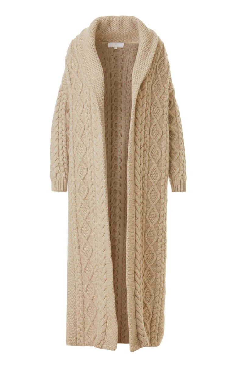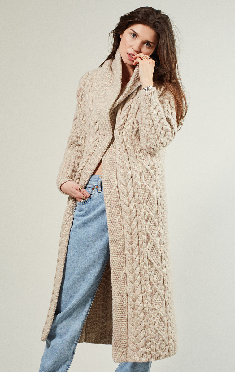 Добротный теплый длинный кардиган (или вязаное пальто). В этой модели мне понравился двойной уютный воротник и планки (связаны жемчужным узором).