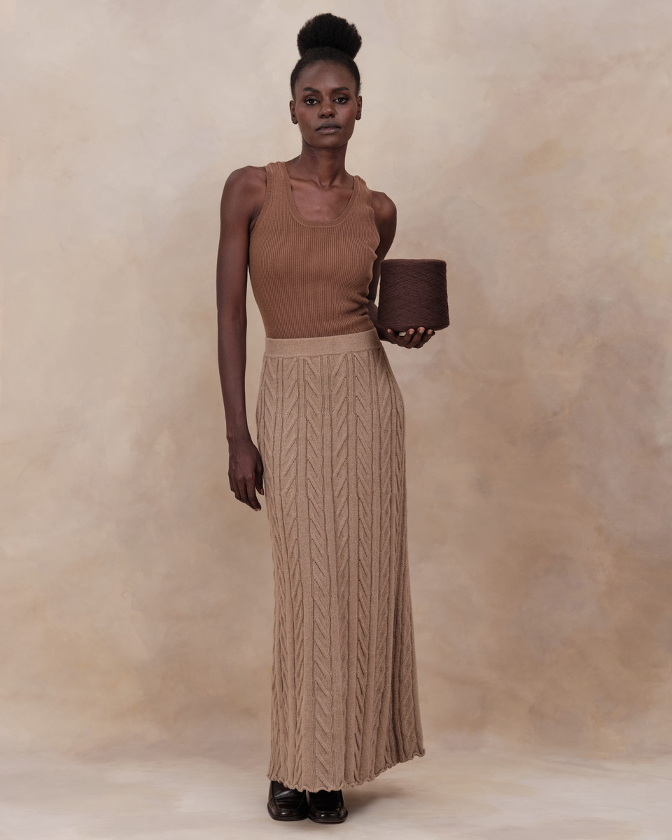 Костюм из укороченного свитера с круглым вырезом и длинной юбки цвета кофе с молоком: