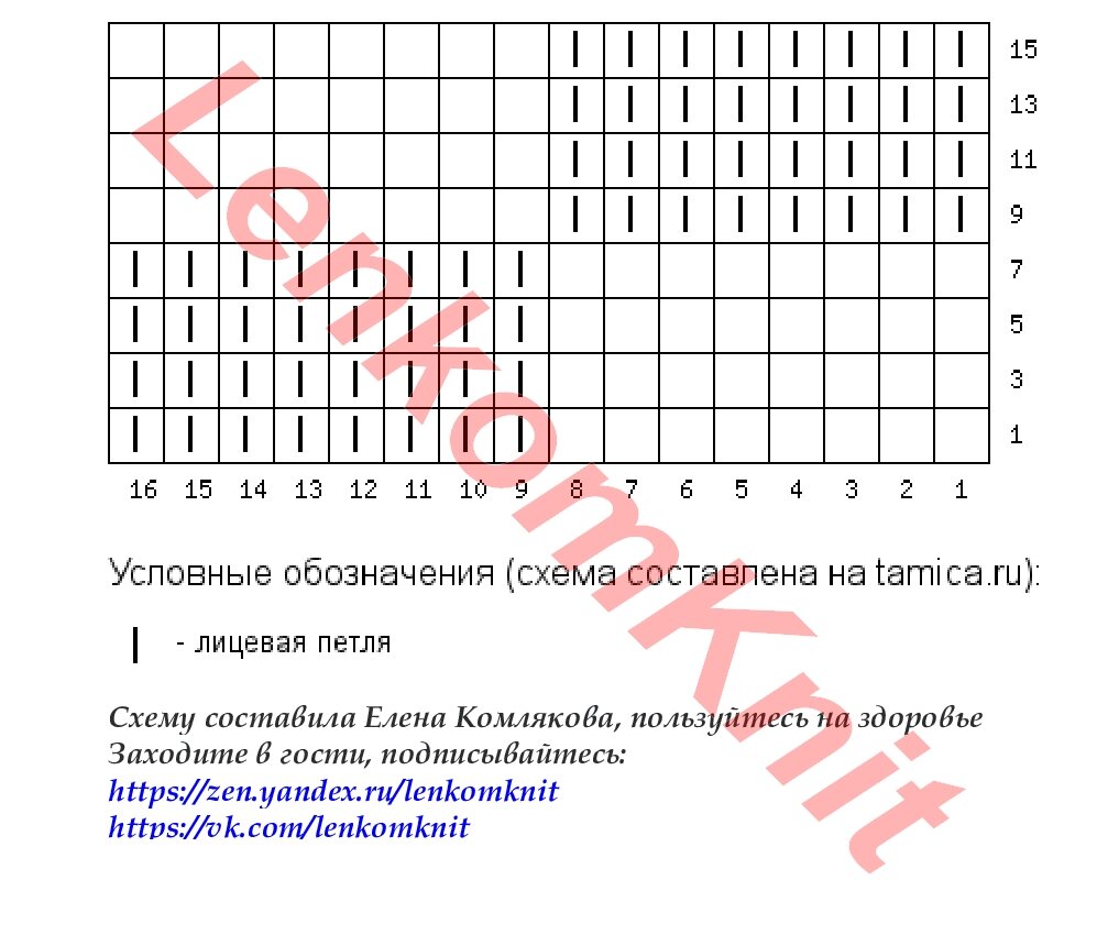 Схема узора № 1. Это - самый простой узор в свитере, в нем чередуются прямоугольники из лицевой и изнаночной глади (каждый - 8 петель и 8 рядов). На схеме - полный раппорт этого узора. Судя по следующему узору, в ширину этот узор - 4 рапорта = 64 петли.