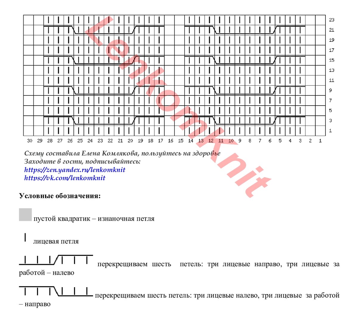Схема узора № 5 - широкие косы. На схеме - две косы, а на свитере их, скорей всего, четыре (около 60 петель).