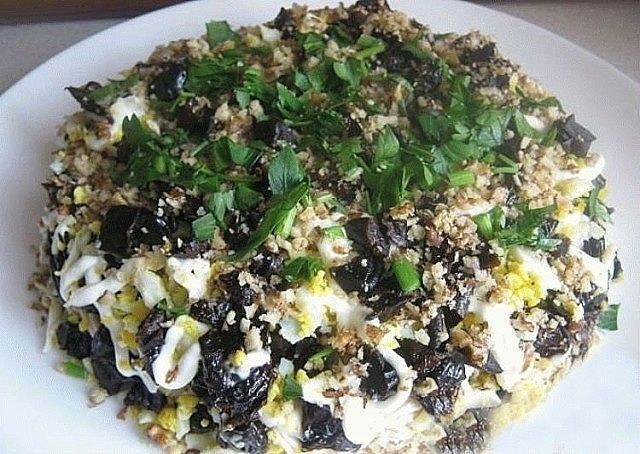 Яйца натереть на терке и посыпать ими чернослив, промазать майонезом.