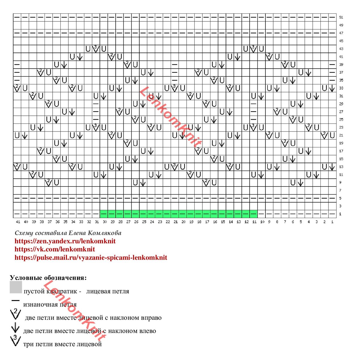 На схеме нарисован один раппорт узора в высоту (полностью), а в нижней части раппорт выделен зеленой полосой