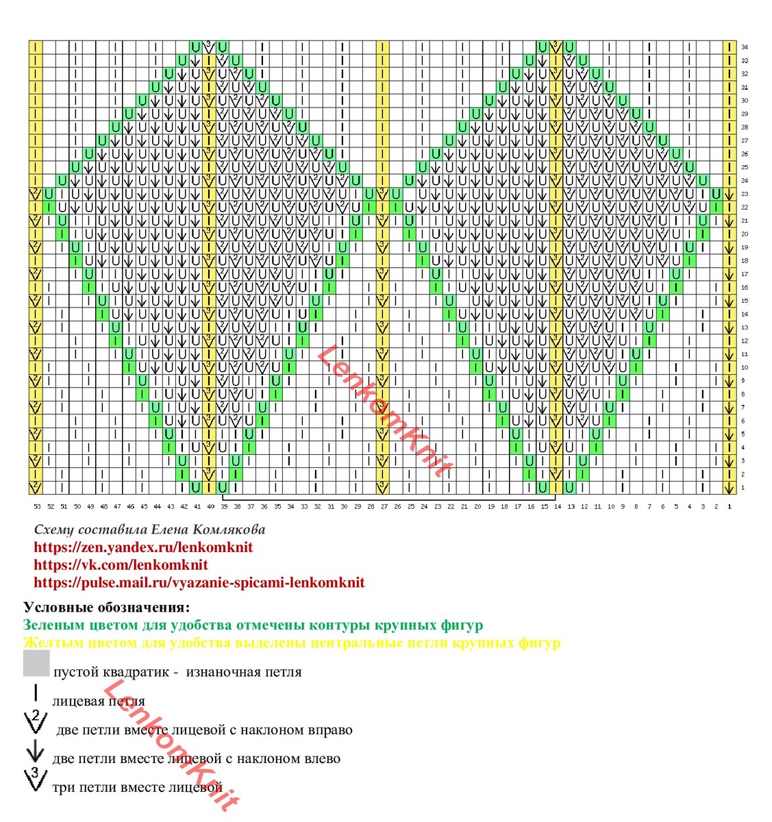 Для удобства зеленым цветом на этой схеме отмечены контуры крупных фигур, а желтым цветом - центральные петли этих крупных фигур. Это может понадобиться в самом начале вязания для разметки петель, когда раппорт еще не виден.