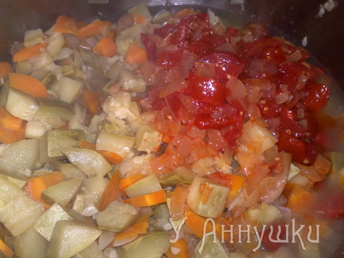 В готовой икре попадаются маленькие вкрапления кожуры помидоров. Если вы хотите, чтобы икра была абсолютна однородной, перед приготовлением снимите с помидоров кожуру.Добавьте лук с помидорами в кастрюлю к потушенным овощам. Остудите овощи.