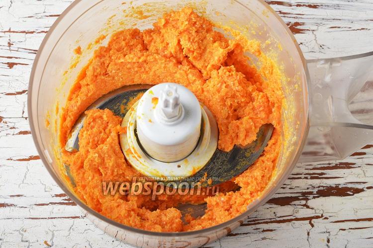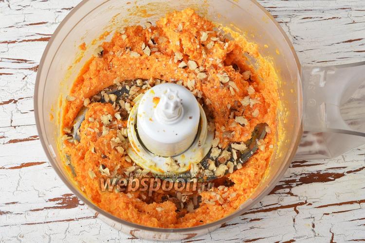 Морковь 250 г отварить до готовности, очистить. Яйца отварить вкрутую, очистить. В чашу кухонного комбайна (насадка металлический нож) поместить нарезанные морковь, 2 яйца, майонез (2 ст. л.), 100 г плавленого сыра. Измельчить всё до однородного состояния. Разделить массу на 2 части.