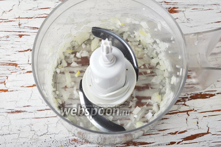 1 репчатый лук очистить, нарезать крупными кусочками, поместить в чашу кухонного комбайна (насадка металлический нож), измельчить.