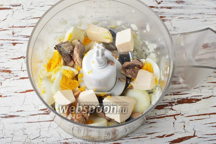 Добавить к луку рыбу (из 1 банки, без жидкости), нарезанные варёные яйца (3 штуки), 100 г плавленого сыра, 2 ст. л. майонеза.