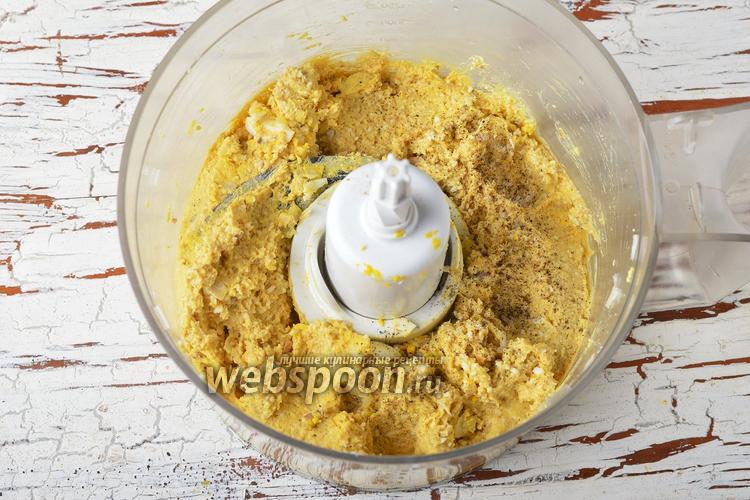 Измельчить до однородности. Приправить по вкусу солью и чёрным молотым перцем. Отложить 2 столовые ложки массы, а остальную разделить на 2 части.