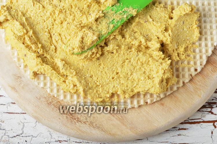 Накрыть вторым вафельным коржом. Слегка прижать. Смазать сверху одной частью из моркови. Накрыть вафельным коржом. Повторить все слои ещё раз.