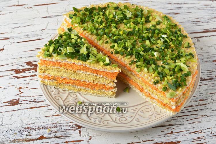 Сверху смазать торт отставленной массой из рыбных консервов (2 ст. л.) и щедро украсить мелко нарезанным зелёным луком (0,5 пучка). Оставить торт на 15 минут, а затем нарезать на порции и можно подавать.