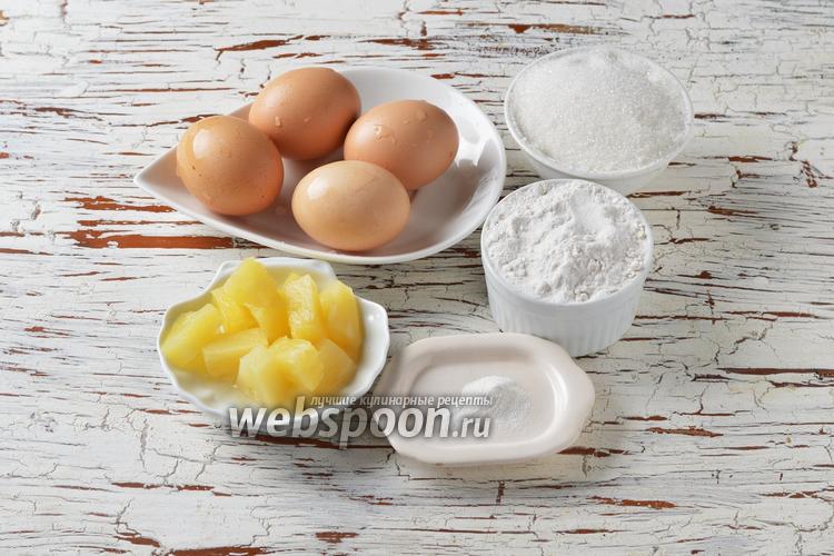 Для работы нам понадобятся яйца, мука, сахар, разрыхлитель, консервированный ананас.
