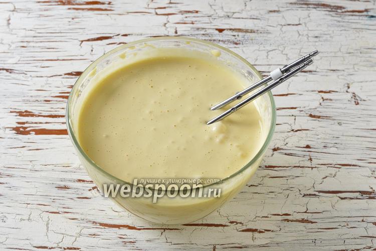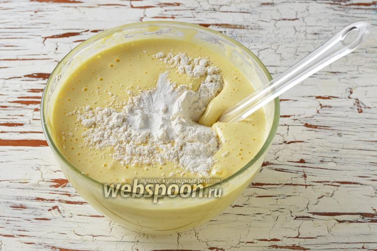 160 грамм муки просеять и соединить с 0,5 ч. л. разрыхлителя. Перемешать. Частями ввести мучную смесь в яичную, тщательно, но аккуратно размешивая всё круговыми движениями вручную, с помощью кулинарной лопатки.