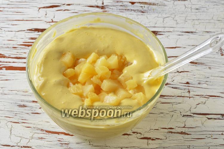 Кусочки ананаса сцедить от сиропа. Если кусочки ананаса оказались большими — разрезать их на кусочки помельче. Вмешать кусочки ананаса в тесто.