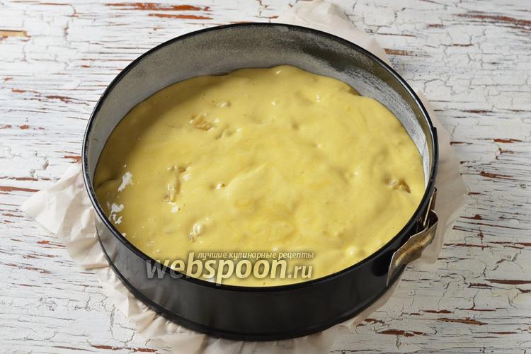 Форму (диаметром 24 сантиметра) выложить пергаментом. Смазать дно и стенки подсолнечным маслом (1 ст. л.) и присыпать мукой (1 ст. л.). Выложить тесто в форму и разровнять.
