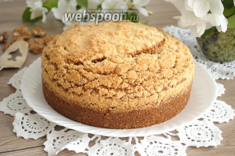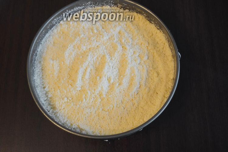 Сверху на пирог выложить отложенную ранее крошку (штрейзель). Равномерно распределить по всей поверхности.