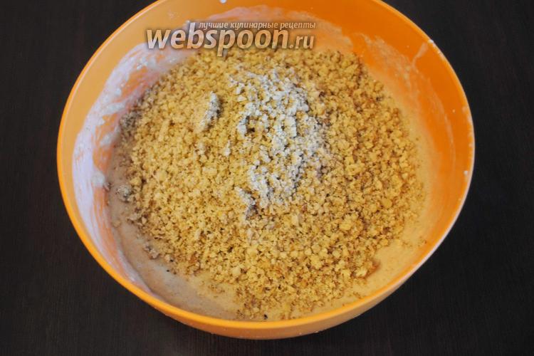 Добавить 150 грамм молотых грецких орехов. Всё хорошо перемешать.