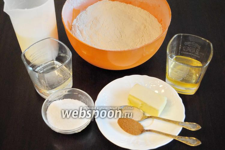 Для приготовления теста подготовить продукты: муку пшеничную, молоко, дрожжи, масло сливочное и сахар.