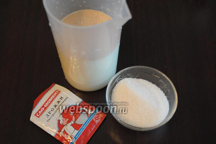 Для опары в тёплом молоке (320 мл) размешать сахар (3 ст. л.) и дрожжи (1,5 ч. л.). Поставить в тёплое место для активизации дрожжей.