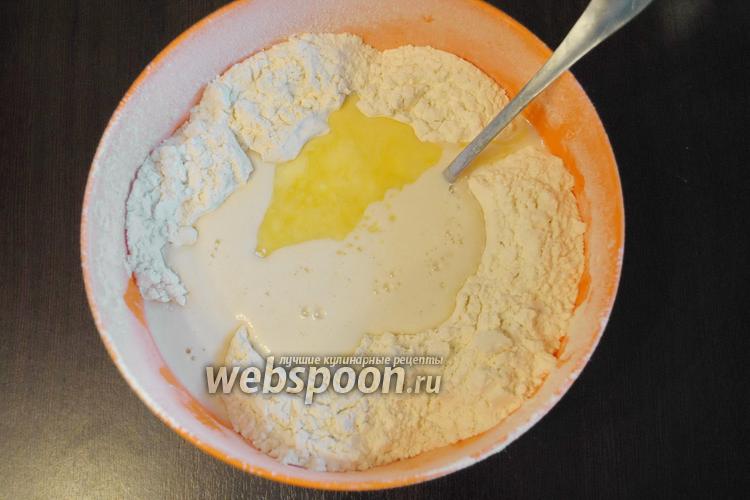 Муку (500 г) просеять, влить опару и растопленное сливочное масло 30 г.