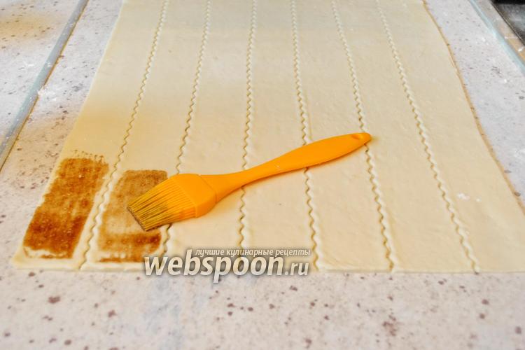 Каждую часть раскатать в прямоугольник. Прямоугольник разрезать на полоски, шириной 5-6 см. Кулинарной кистью нанести на каждую полоску теста начинку из корицы с маслом и мёдом.