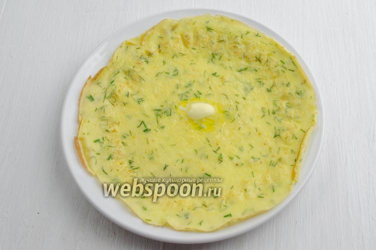Готовый блинчик сбросить на тарелку. Выложить на него небольшой кусочек сливочного масла (20 г понадобится на все блинчики).