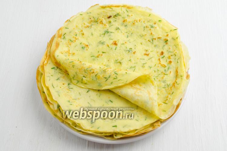 Готовые блинчики можно начинить творогом, тёртым яблочком или просто подать, как самостоятельное блюдо. Блинчики получаются тонкими, красивыми за счёт рубленого укропа.