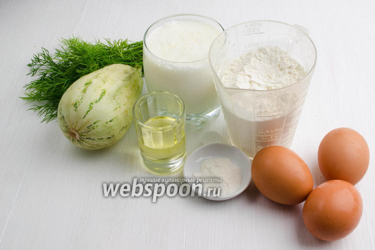 Чтобы приготовить тонкие блинчики, нужно взять яйца, соль, сахар, масло подсолнечное, муку, разрыхлитель, кефир, кабачок, укроп.