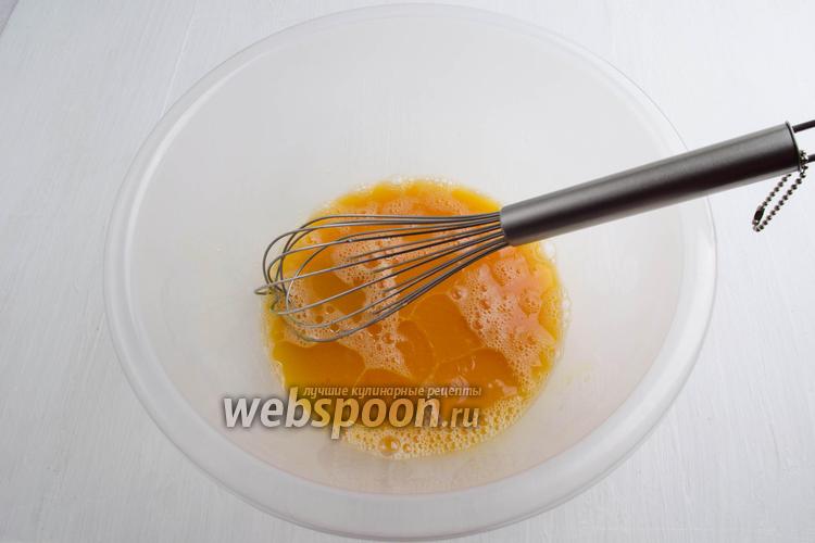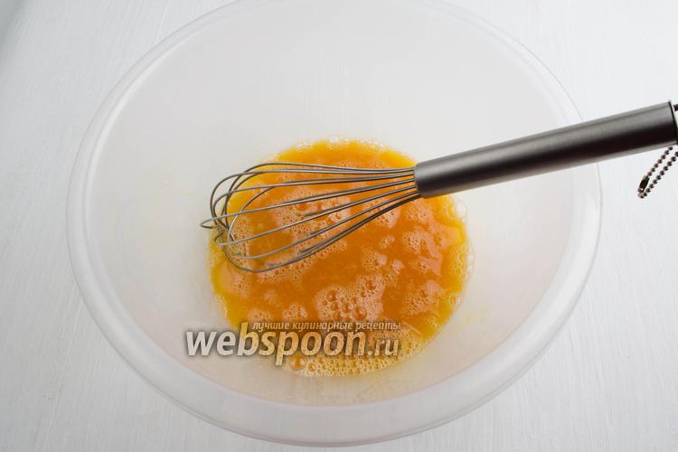 4 яйца хорошо взбить с солью (1 ч. л.) и сахаром (1 ч. л.).