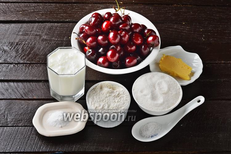 Для работы нам понадобится пшеничная мука, сода, кефир, соль, сливочное масло, сахар, черешня.