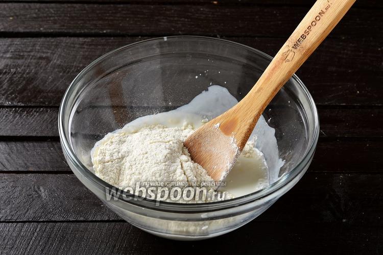 Соединить в миске 250 мл кефира, соль 0,5 ч. л. и мучную смесь.
