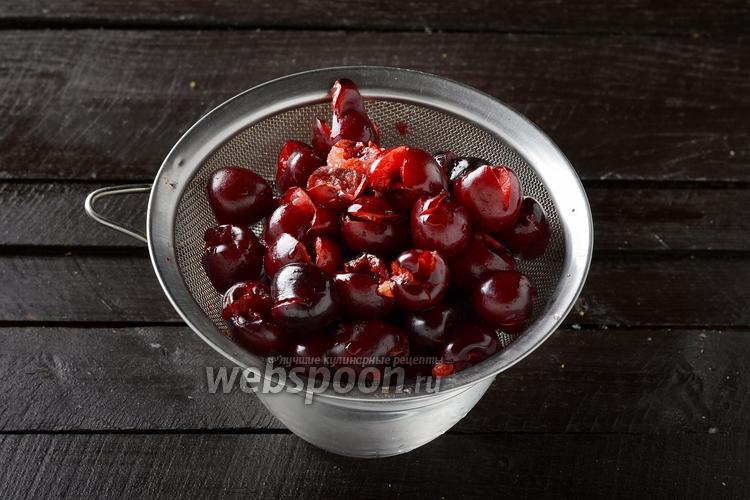 За это время приготовим начинку. Для этого 500 г черешни перебрать, промыть, просушить. Удалить хвостики и косточки. Сцедить образовавшийся сок.