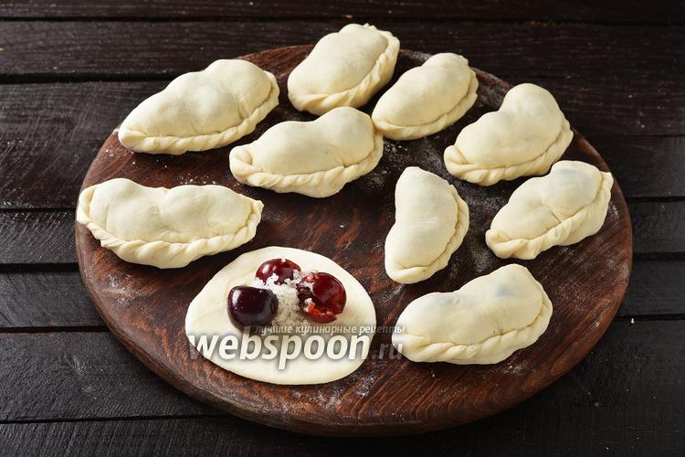 Раскатать каждый кусок теста в лепёшку. На середину лепёшки выложить черешню и немного сахара. Сформировать вареники.