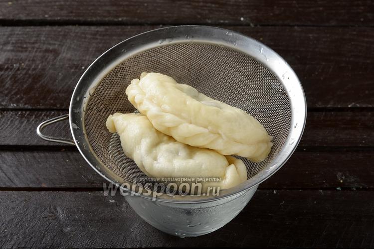 Вынуть вареники шумовкой и переложить на 15-20 секунд в сито или дуршлаг, чтобы стекла вся жидкость.