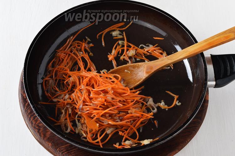 Лук и морковь очистить. Лук нарезать небольшими кубиками (60 г), а морковь (60 г) натереть на тёрке для корейских овощей. Обжарить лук и морковь на подсолнечном масле (2 ст. л.) до мягкости. Охладить.