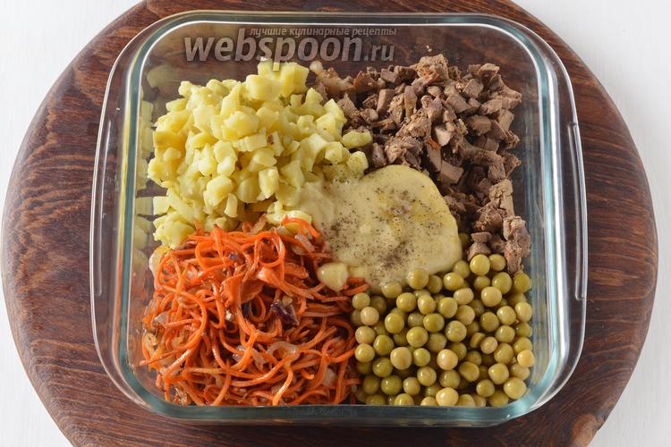 Соединить морковь, лук, консервированный горошек 120 г, печень, 4 ст. л. майонеза, картофель. Приправить солью 0,5 ч. л. и чёрным молотым перцем 0,1 ч. л.