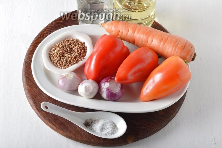 Для работы нам понадобится сладкий перец, гречневая крупа, вода, подсолнечное масло, морковь, репчатый лук, соль, чёрный молотый перец.