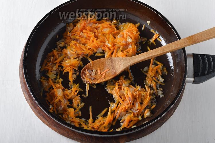 Лук и морковь (по 70 г) очистить. Лук нарезать небольшими кубиками, а морковь натереть на крупной тёрке. Обжарить лук и морковь на подсолнечном масле 3 ст. л. до мягкости.