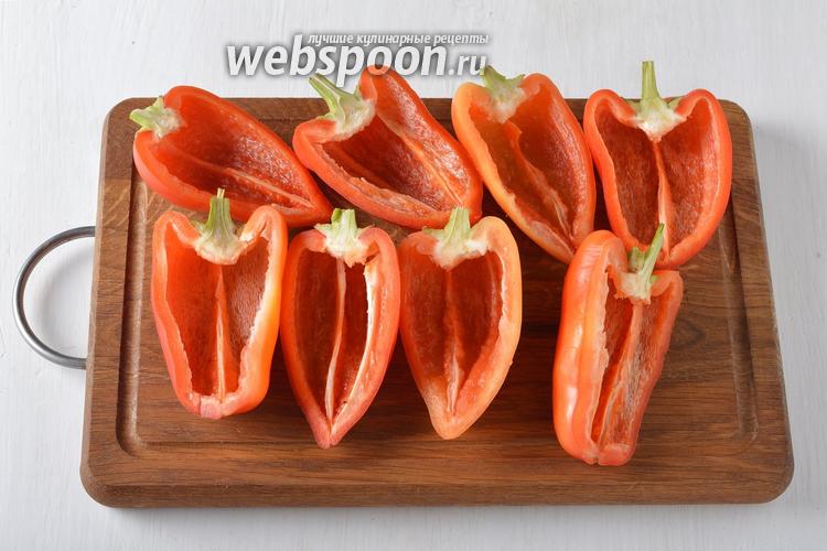 6 перцев разрезать вдоль пополам. Удалить семена.