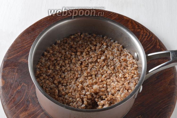 Гречневую крупу 150 г промыть и отварить до готовности.