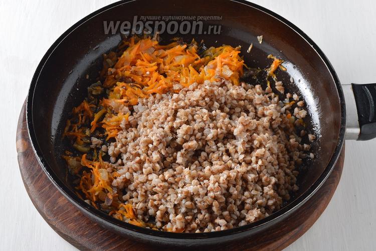 Соединить гречневую кашу, морковно-луковую смесь, соль 0,75 ч. л., чёрный молотый перец 0,2 ч. л. Перемешать.