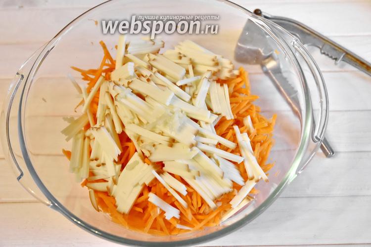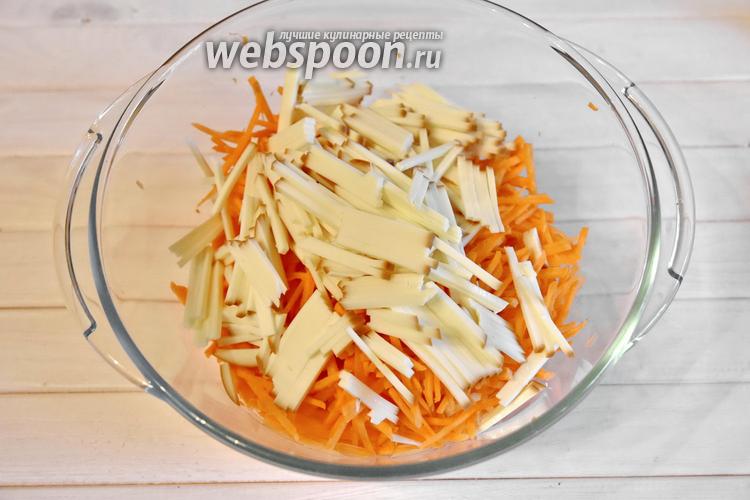 Колбасный плавленный сыр (100 грамм) нарезать соломкой.