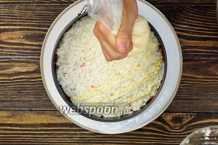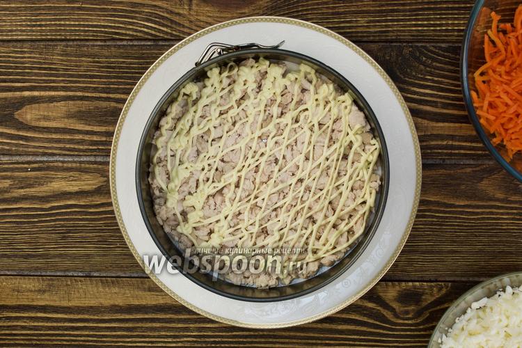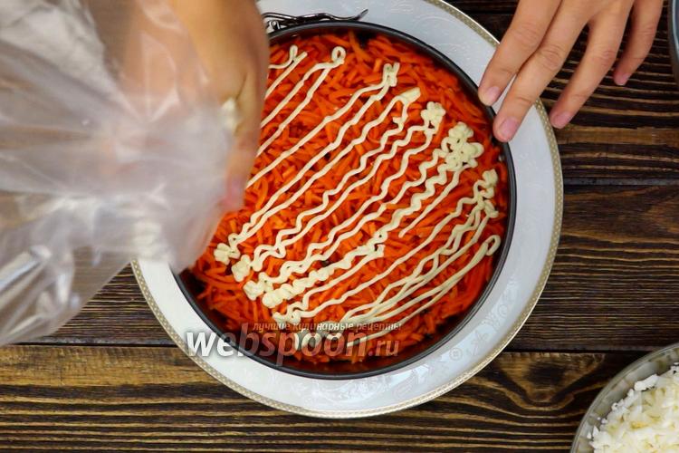 3 слой — морковь по-корейски, которую так же смазываем майонезом.